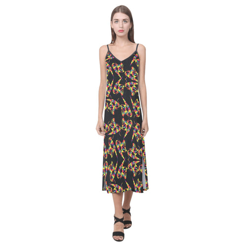 "Abstract Floral Twist on Black" V-Neck Open Fork Long Dress